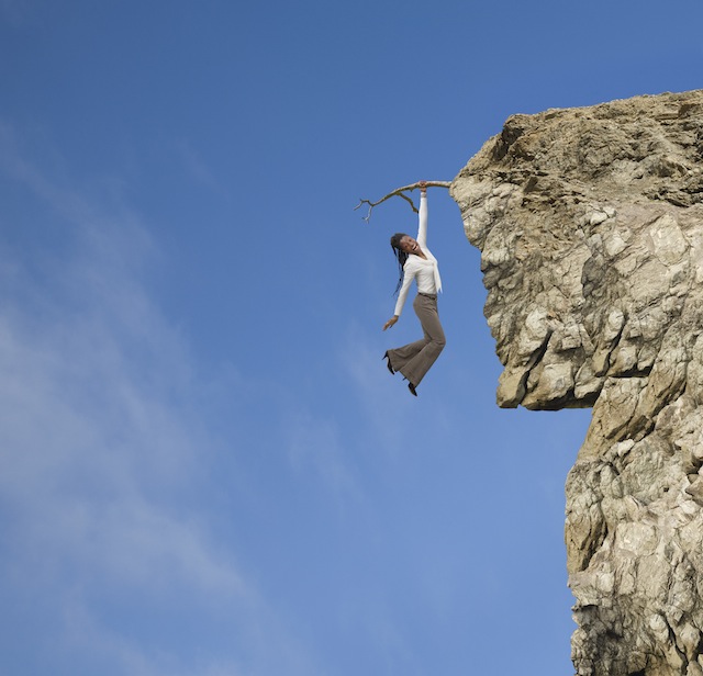 African American woman clinging to branch on cliff