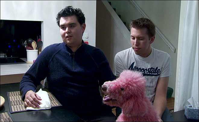 David Beltier, left, says he was attacked by a man while he and his boyfriend, Jeremy Mark, were walking their pink-dyed poodle, Beauty.