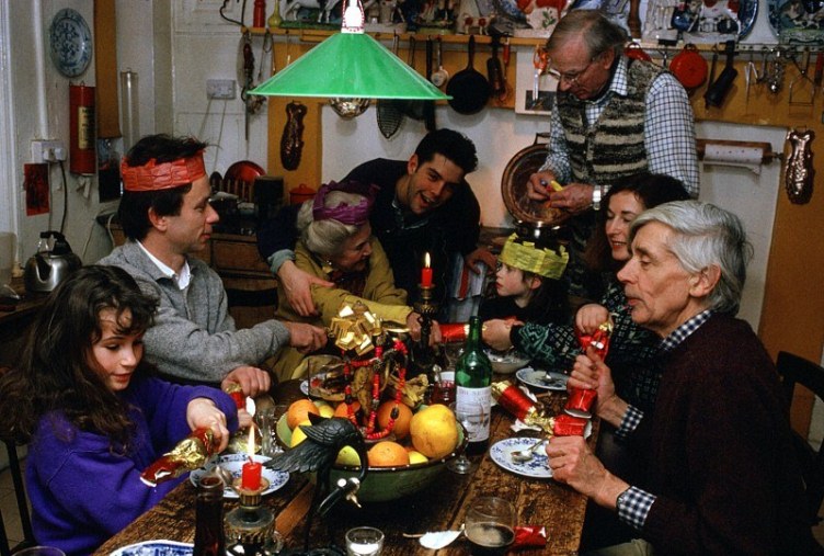 A family enjoying a traditional Christmas lunch. They are wearing paper crowns adn are about to pull their crackers. The extended family is present including great grandparents, grandparents, parents, uncle and aunt and children.