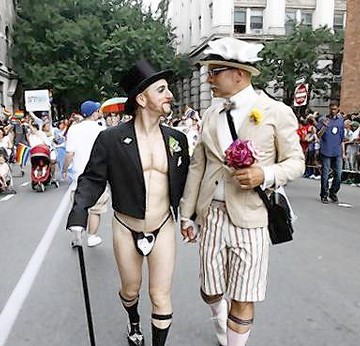 A couple march dressed as bride and groom during the Gay Pride Parade in New YorkWe must all admire the uphill battle the members of the Cardinal Newman Society are waging for the souls of men and support their efforts in any way possible.
