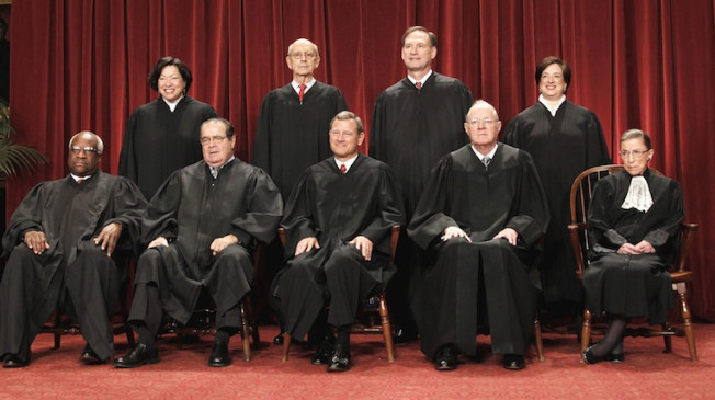 l-R Front Row - Clarence Thomas, Antonin Scalia, John Roberts, Anthony Kennedy and Ruth Bader Ginsgurg Ginsburg. Standing - Sonia Sotomeyer, Stephen Breyer, Samuel Alito and Elena Kagan