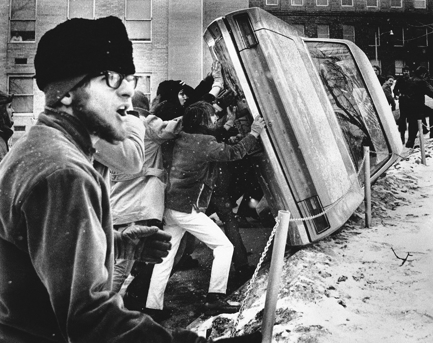 Protestors overturn police car during antiwar protest on the University of Wisconsin’s Madison campus on Feb. 12, 1970. UW students and others clashed with police as they demonstrated against recruiting by the General Electric Company. (AP Photo/Ron Frehm)